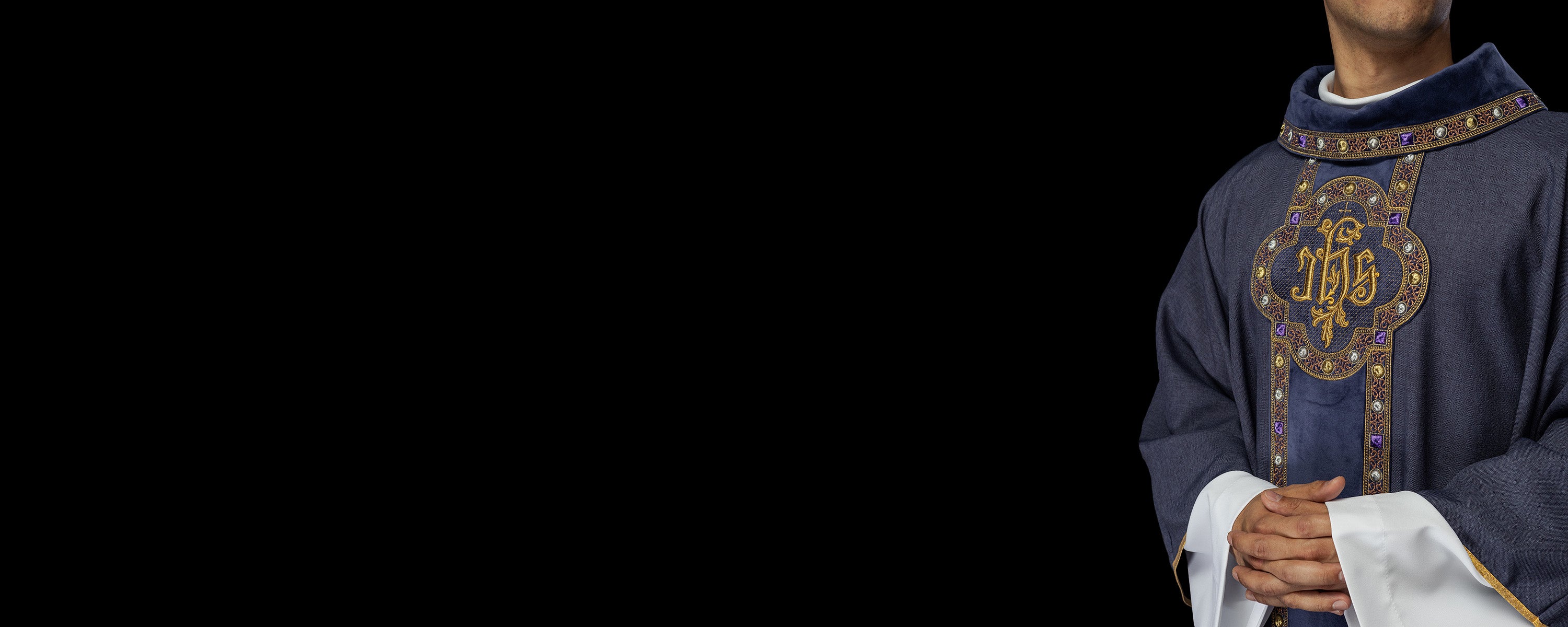 Chasuble violette avec motif brodé de croix sur tissu ornemental