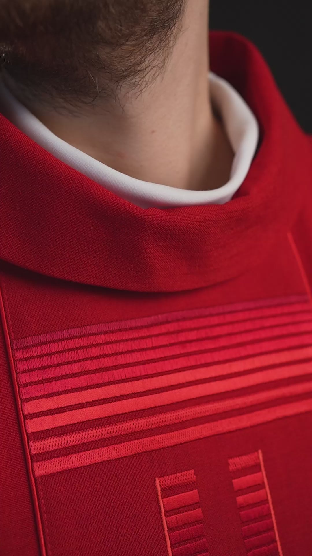 La chasuble est fabriquée dans un tissu de haute qualité, décoré d'une broderie représentant le symbole des croix, réalisée avec des fils rouges, ce qui lui confère un caractère unique. Les bords de la chasuble sont bordés d'un passepoil de satin rouge, harmonieusement assorti à la broderie.