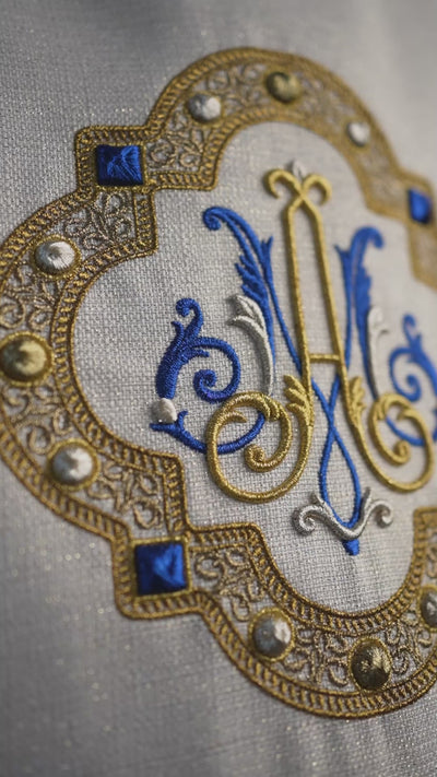 Blason marial brodé : L’élément central de la chasuble est un blason marial finement brodé en fil doré, symbole de vénération et de dévotion envers la Mère de Dieu.